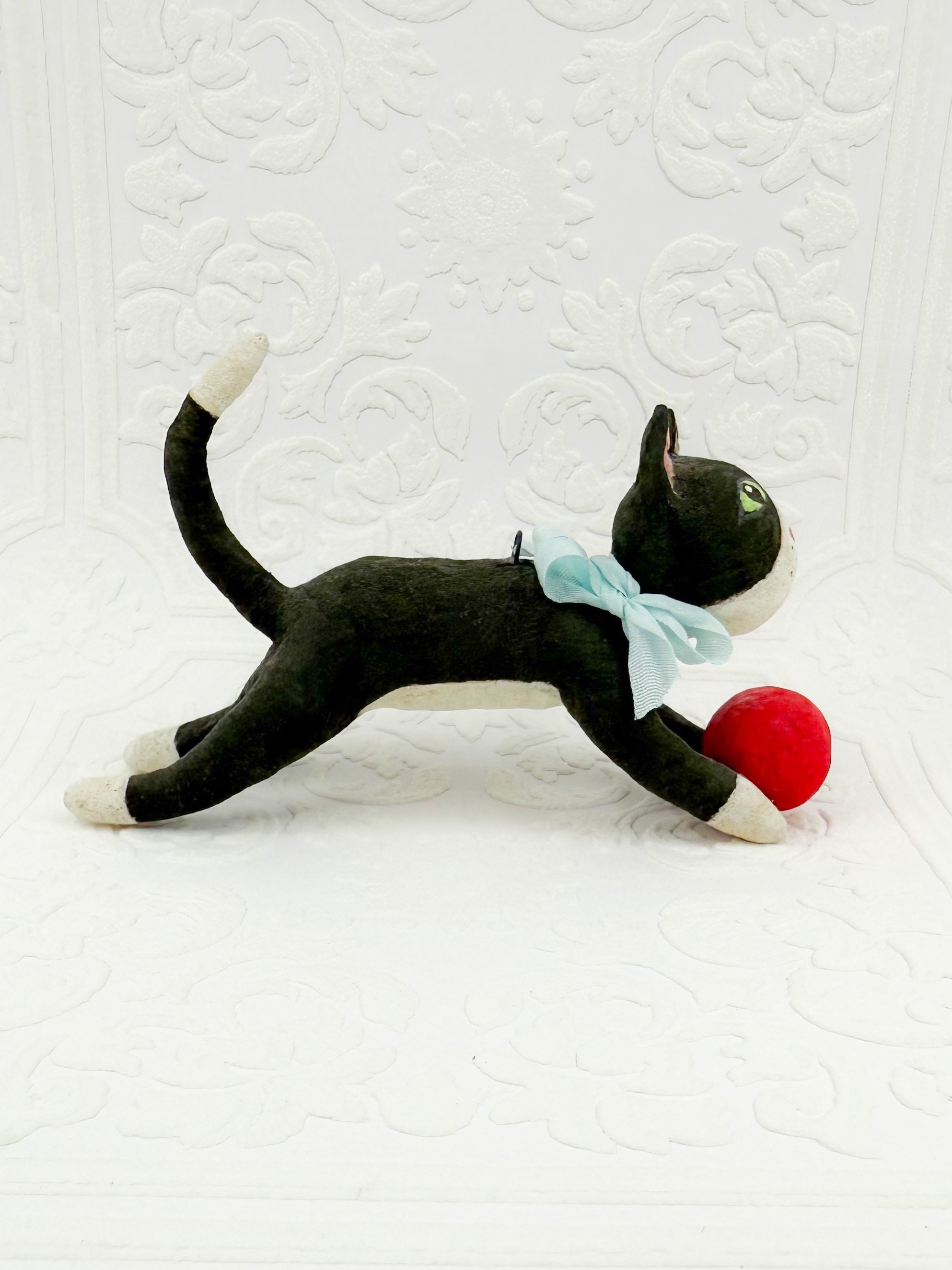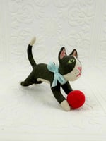 Vintage/antique inspired Playful tuxedo cat with red ball spun ornament by Arbutus Hunter. Wears a hand-dyed blue silk ribbon/bow and holds a red spun cotton ball. He's been created using century-old spun cotton techniques.