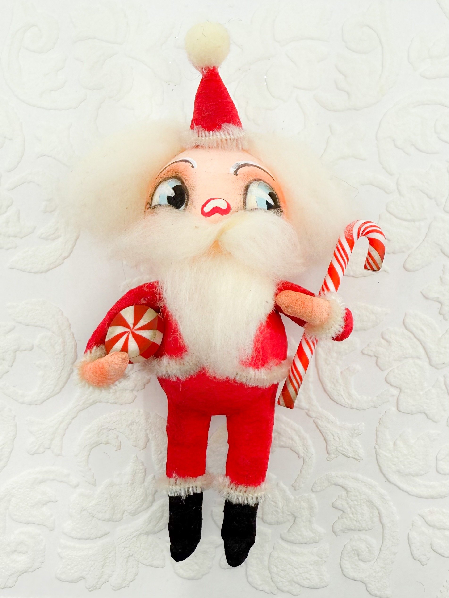Vintage/antique inspired Santa with Candy Cane spun cotton holiday ornament by Arbutus Hunter. Head turns for more posing options. Aged for a time-worn appearance. He's been created using century-old spun cotton techniques.