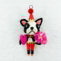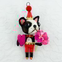 Vintage/antique inspired Sweetheart Pup I spun cotton Halloween ornament by Arbutus Hunter. His head turns for extra posing options. He wears a metal bow tie, a Swarovski crystal button, holds a spun cotton heart and a bouquet of flowers. Aged for a time-worn appearance. He's been created using century-old spun cotton techniques.