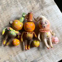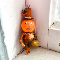 Vintage/antique inspired veggie/pumpkin head goblin spun cotton Halloween ornament by Arbutus Hunter. His head turns for extra posing options. He wears a metal bow tie, a festive top hat and holds a tiny expressive spun cotton jack o lantern. Aged for a time-worn appearance. He's been created using century-old spun cotton techniques.